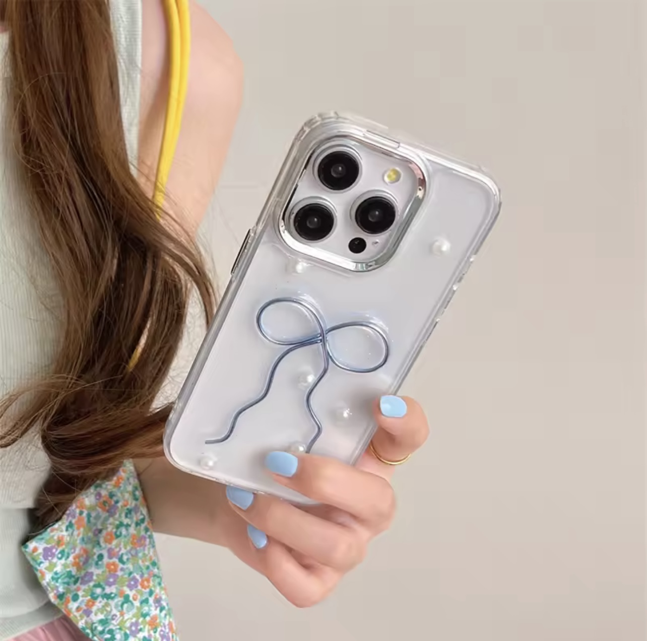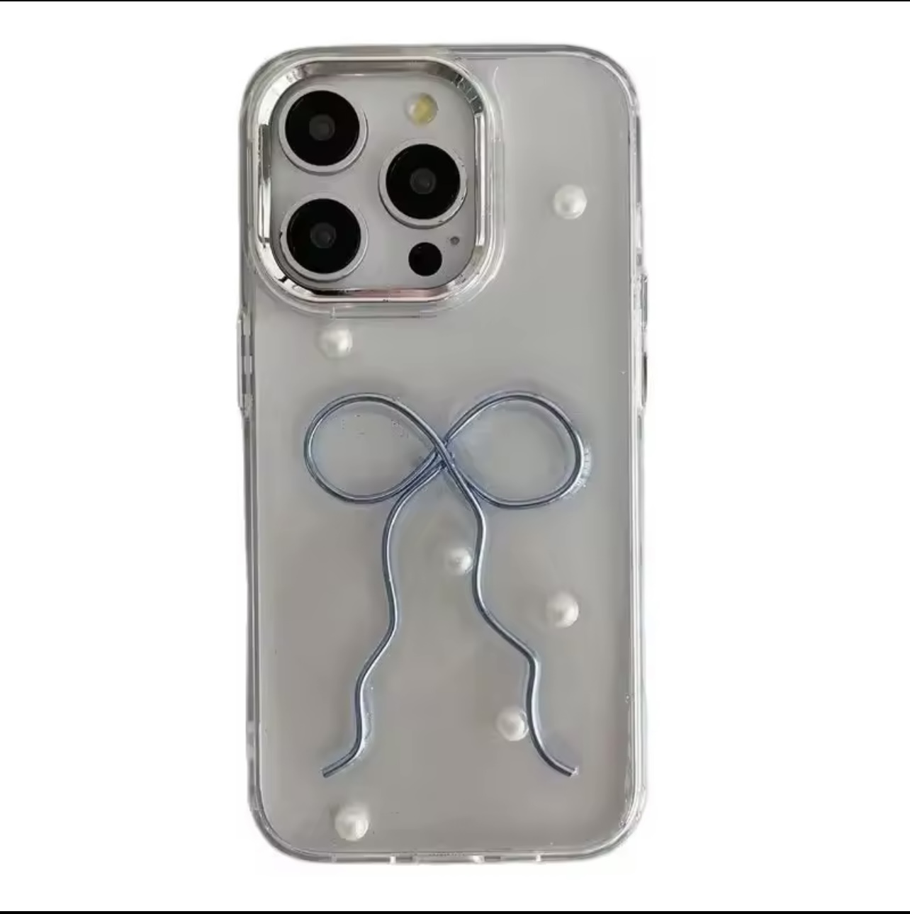 A clear case with a blue embossed ribbon motif. The sides of the case are covered in pretty little glitter, giving it a luxurious and elegant look. Perfect for casual and daily.